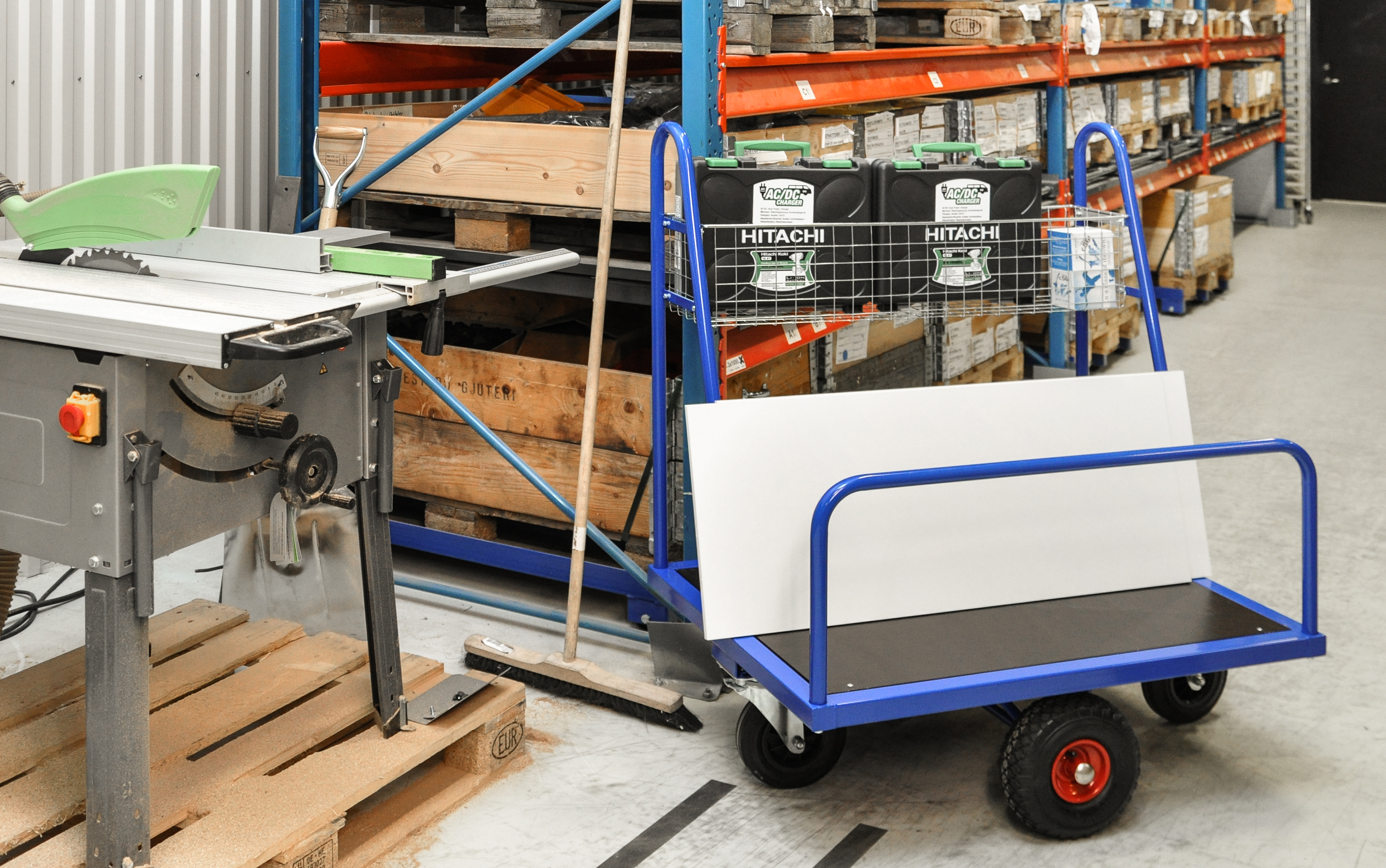 Chariot porte panneau avec plateau en contre plaqué 2 roues fixes centrales pneumatiques rendent le chariot parfaitement maniable même chargé au maximum. Petit panier au centre très utile pour les petits objets.
